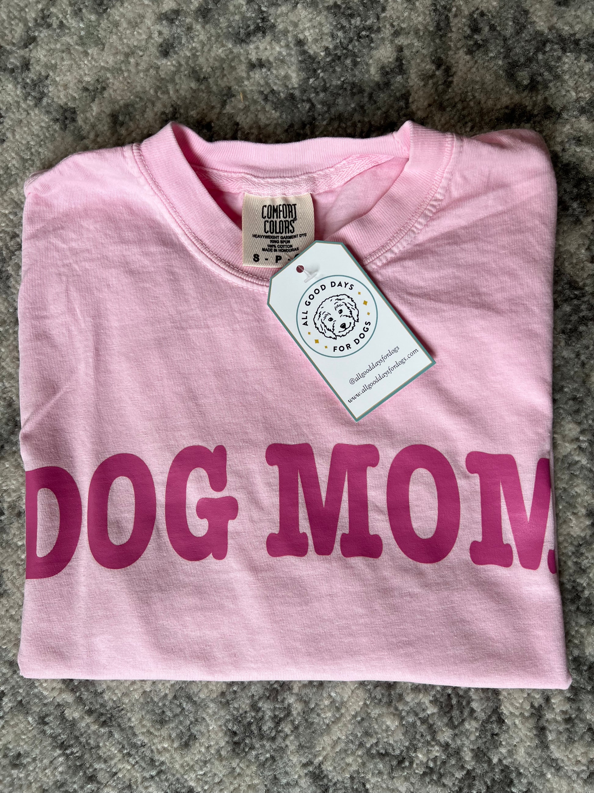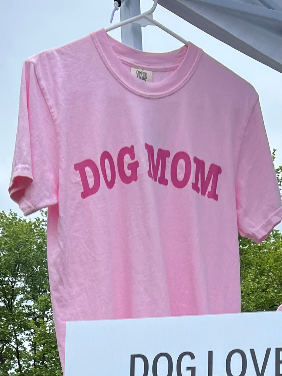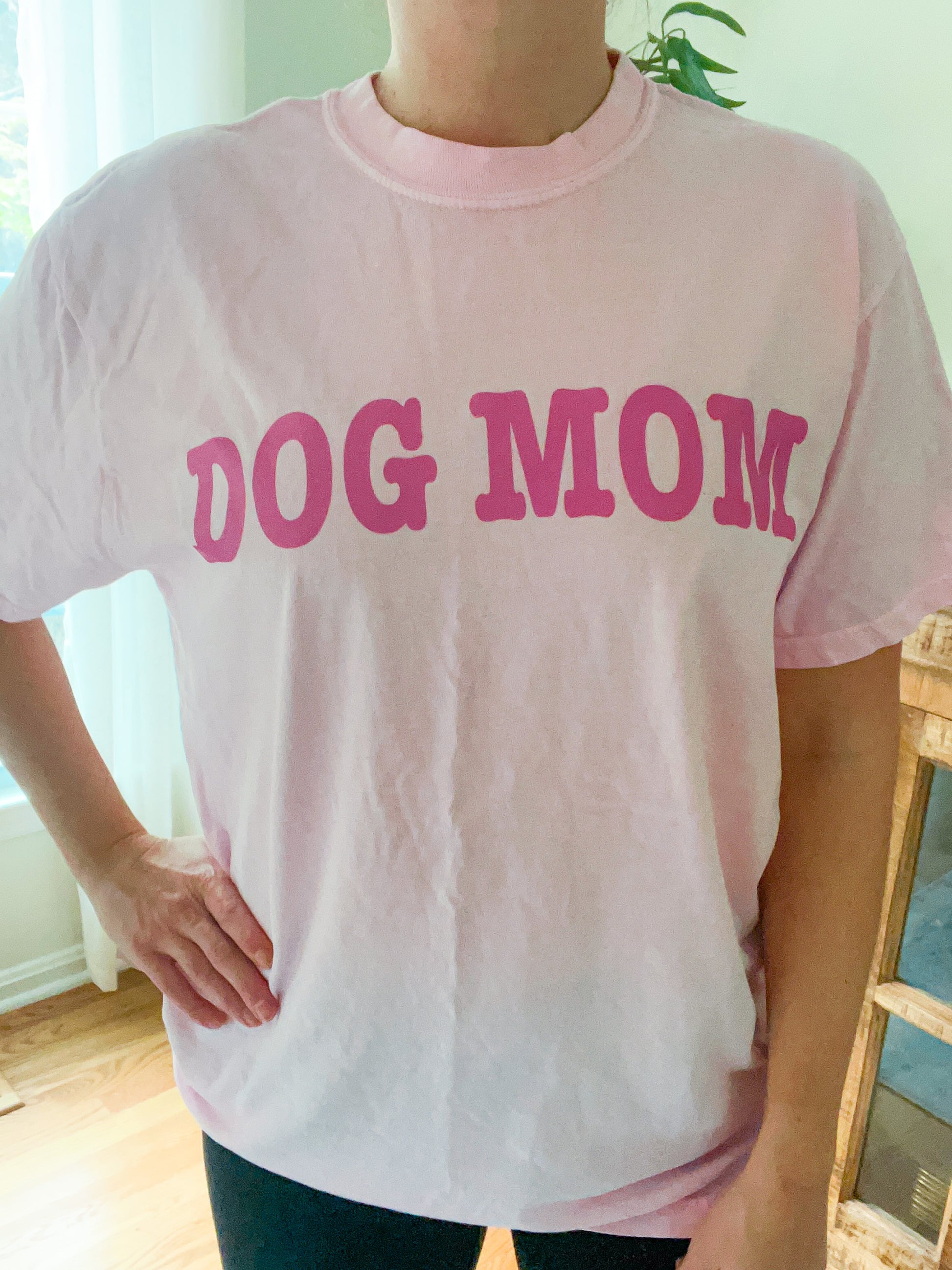 Celebrate the amazing Dog Mom in your life with the softest t-shirt in the perfect light pink color for Spring! Pictures show the shirt in indoor and outdoor lighting. The shirt is a bright link pink color with dark pink font.