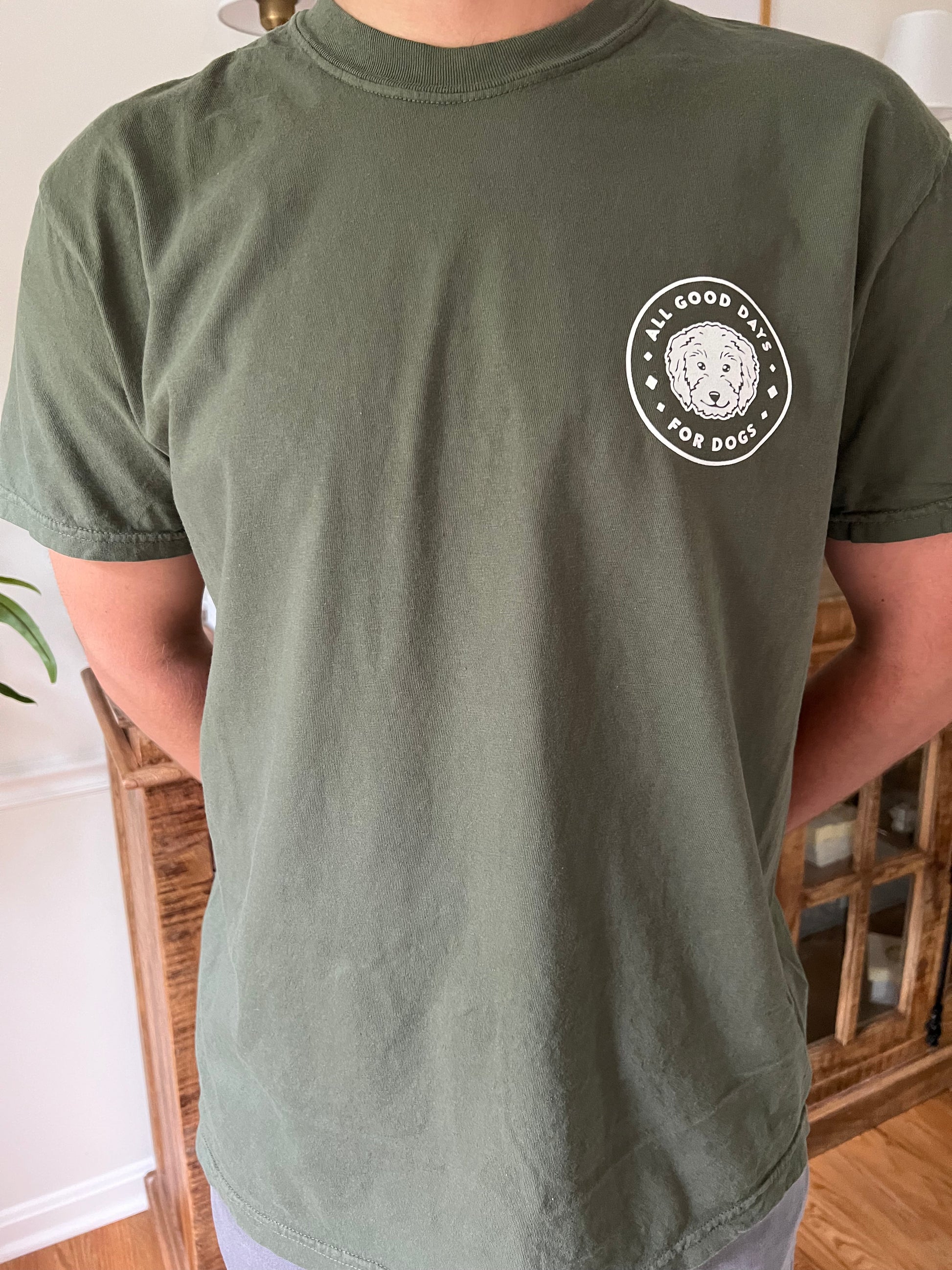 Perfect for Fathers Day and all of the Dog Dads out there! Our classic soft t-shirt in Hunter Green with our signature logo in white.